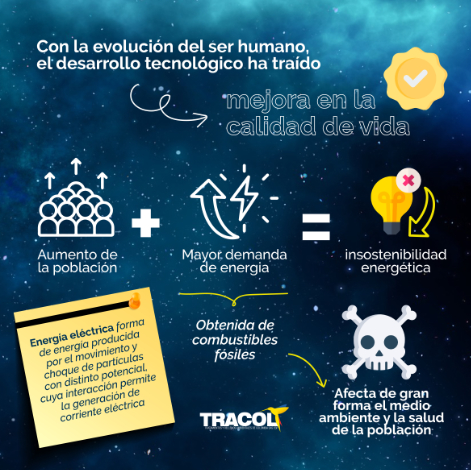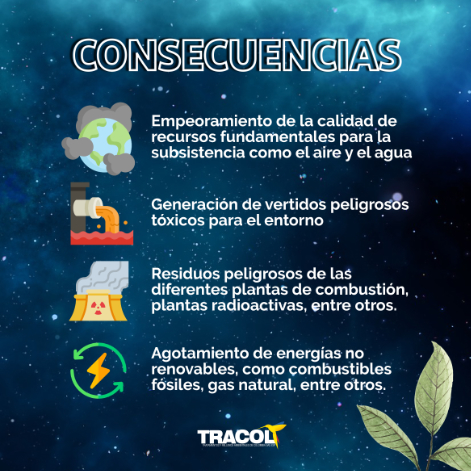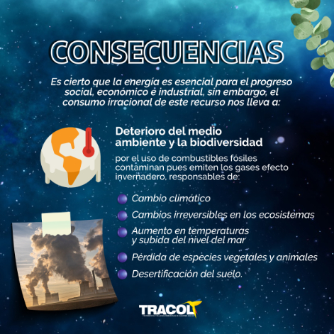 En TRACOL S.A.S., nos preocupamos por el medio ambiente y tu salud. Por ello, en este espacio te brindamos información sobre las consecuencias del consumo energético insostenible y te ofrecemos algunas acciones que puedes tomar para contrarrestar este daño ambiental.