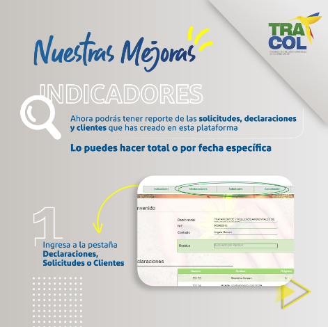 En TRACOL S.A.S., estamos siempre pensando en tus necesidades. Por eso, nos esforzamos constantemente por mejorar y brindarte el mejor servicio posible. Estamos emocionados de presentarte una de nuestras nuevas actualizaciones: Indicadores. Esta opción te permitirá tener un reporte detallado de las solicitudes, declaraciones y clientes que has creado en tu plataforma, con el fin de agilizar y optimizar tu búsqueda.